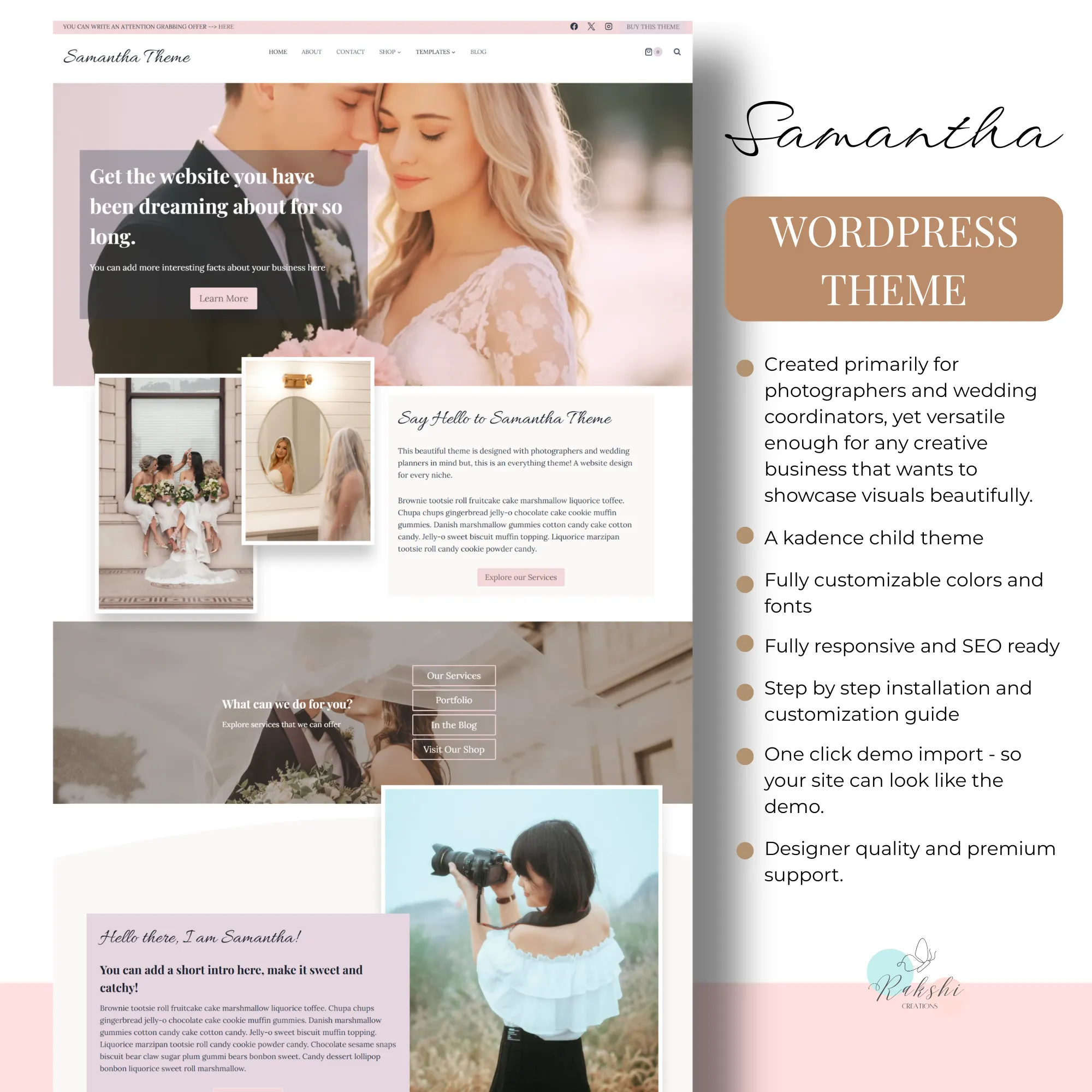 Samantha is an elegant, image-focused WordPress theme designed primarily for photographers and wedding coordinators, yet versatile enough for any creative business that relies on beautiful visuals. With soft typography, balanced white space, and a refined feminine aesthetic, Samantha lets your images take center stage while keeping your site clean, modern, and professional.