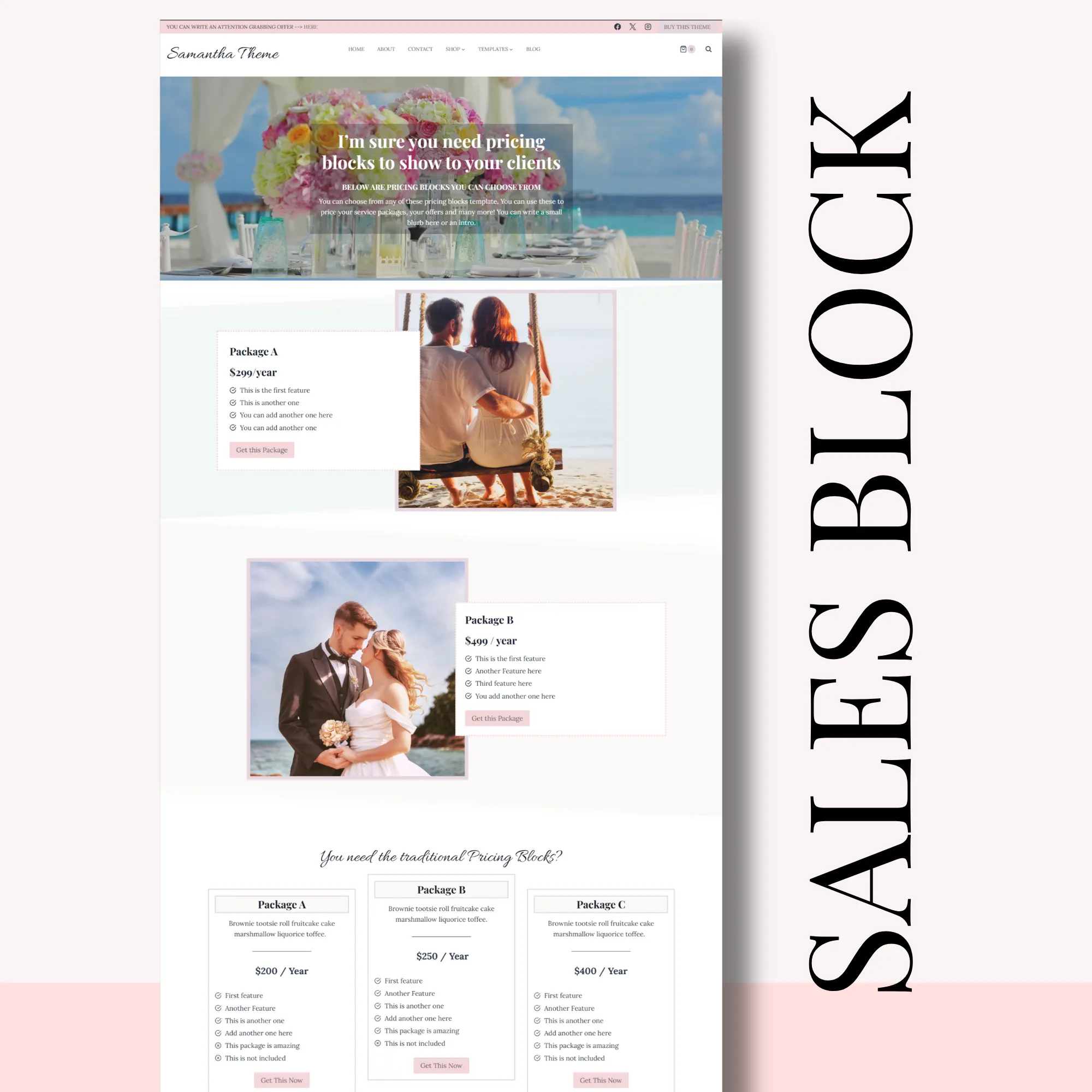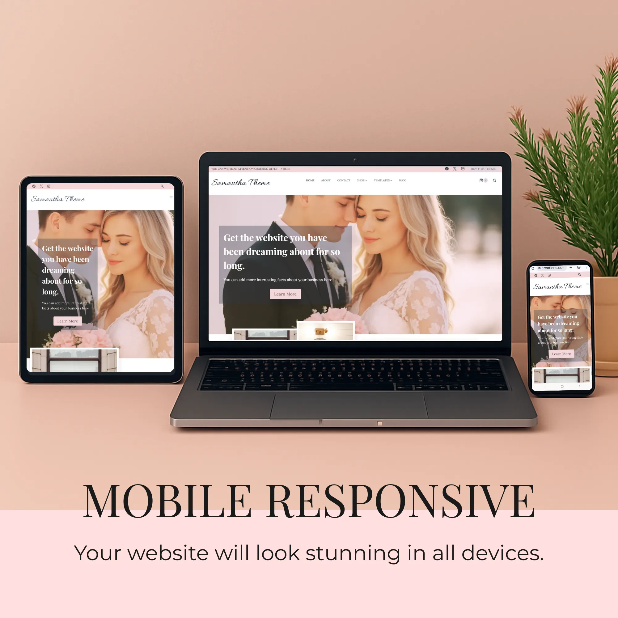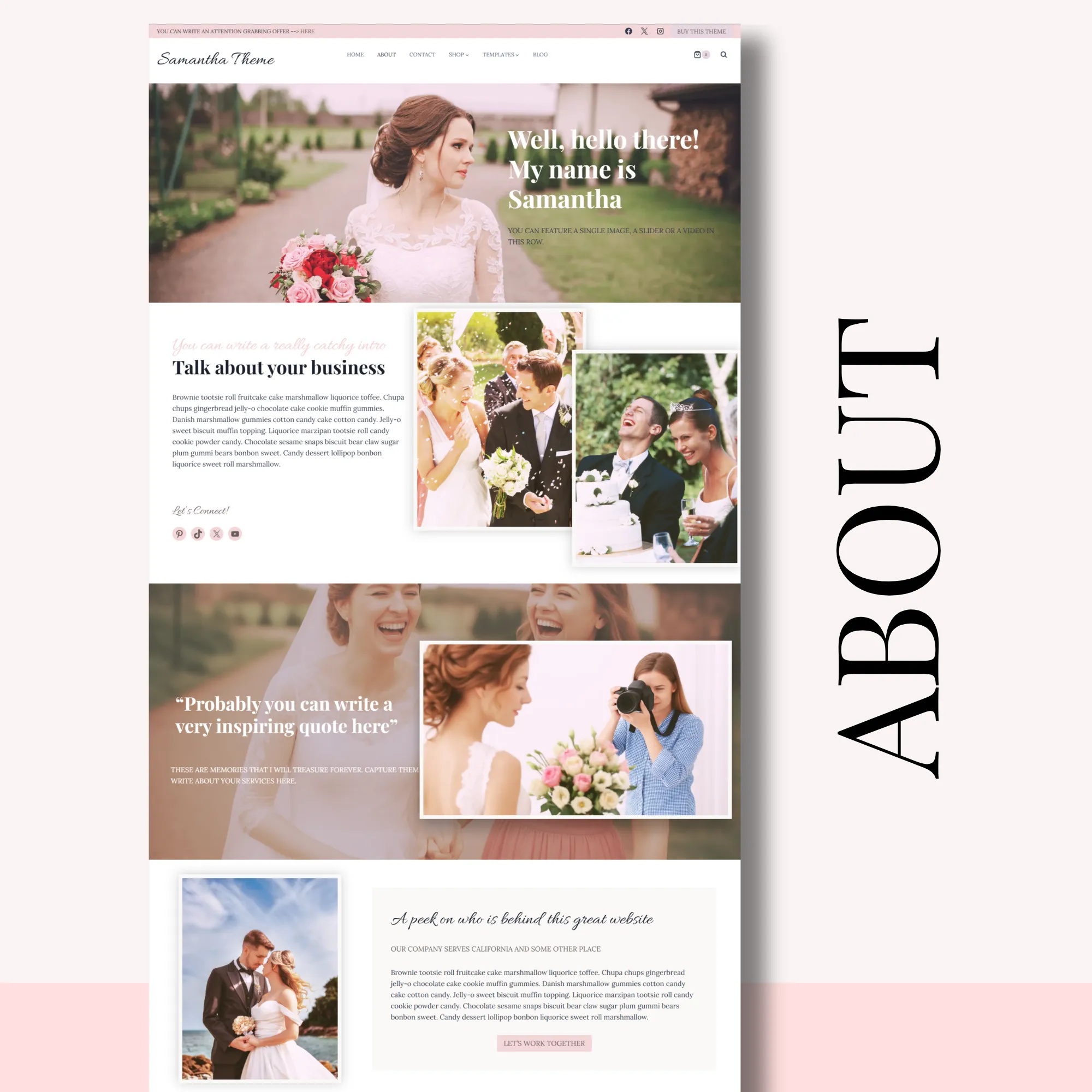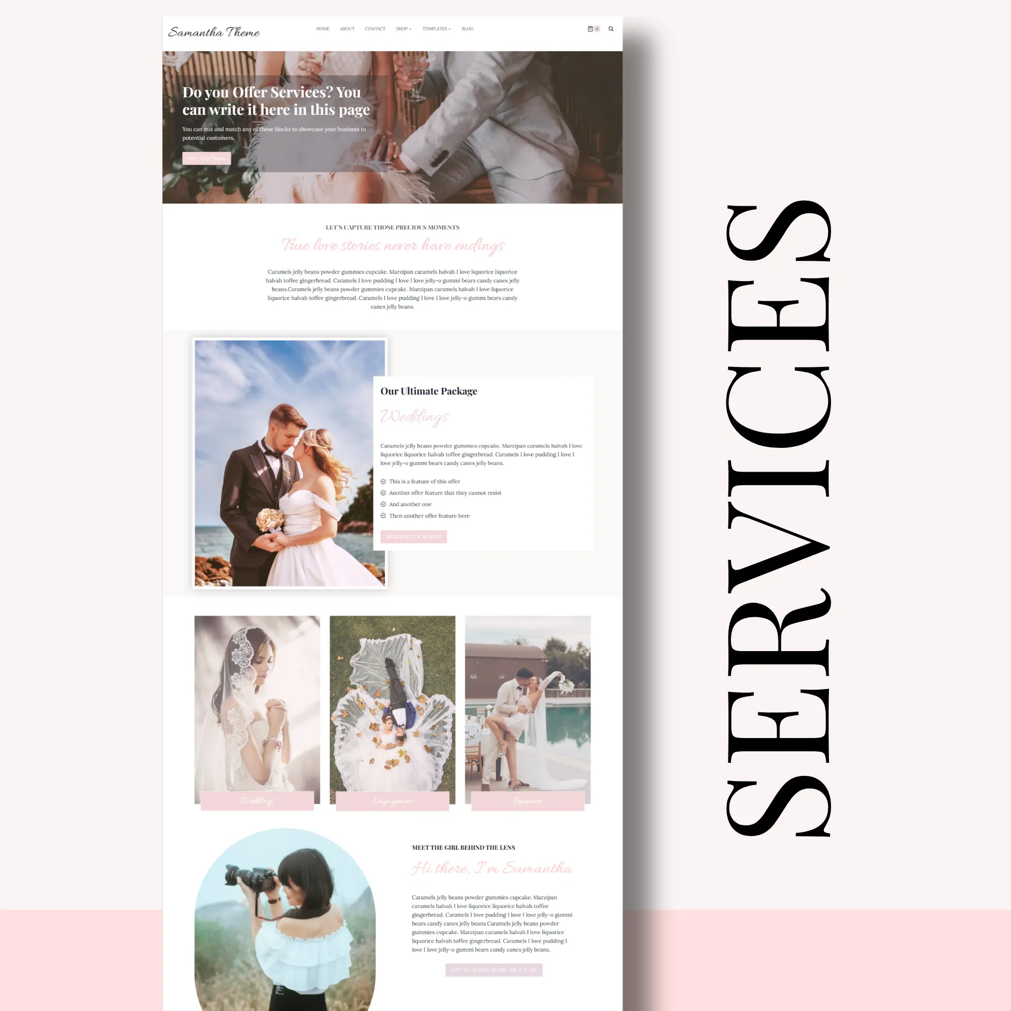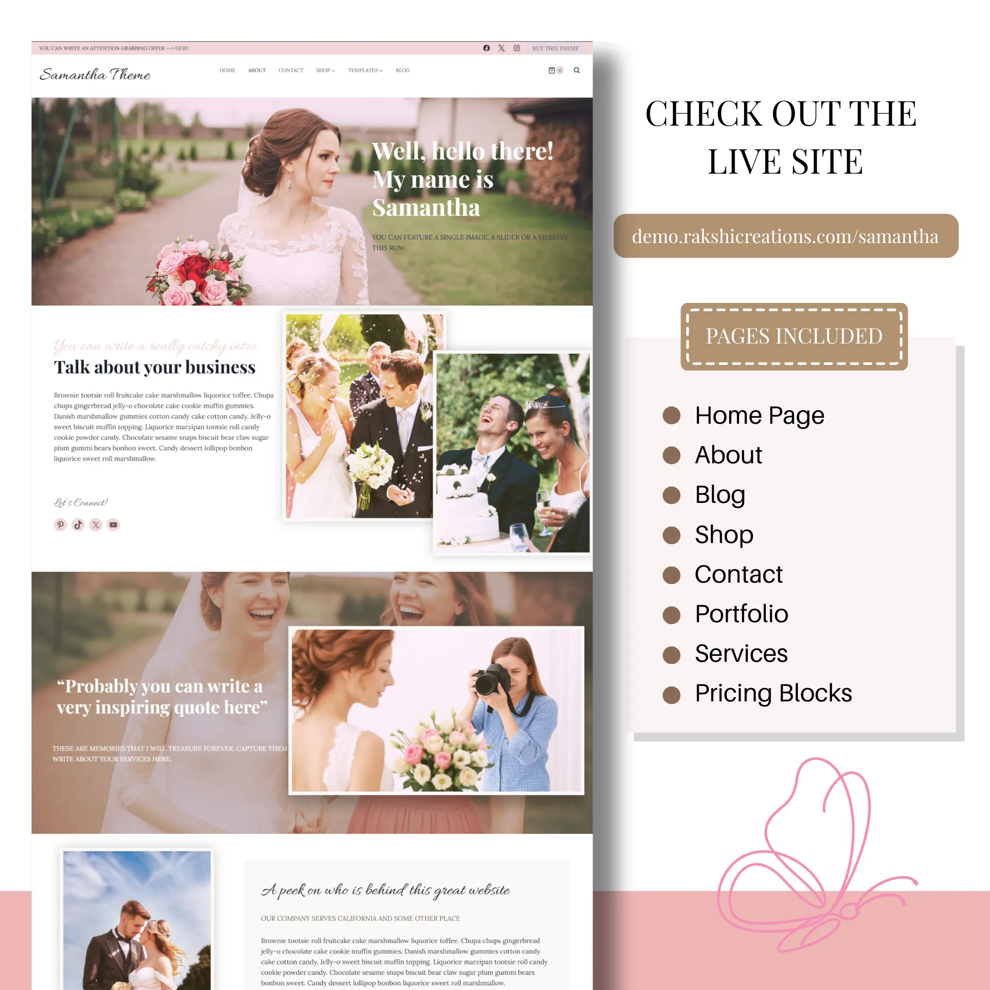 Designed with soft typography, clean layouts, and generous white space, Samantha allows your photos, galleries, and portfolio to take center stage—perfect for wedding professionals, creatives, and service-based businesses.
